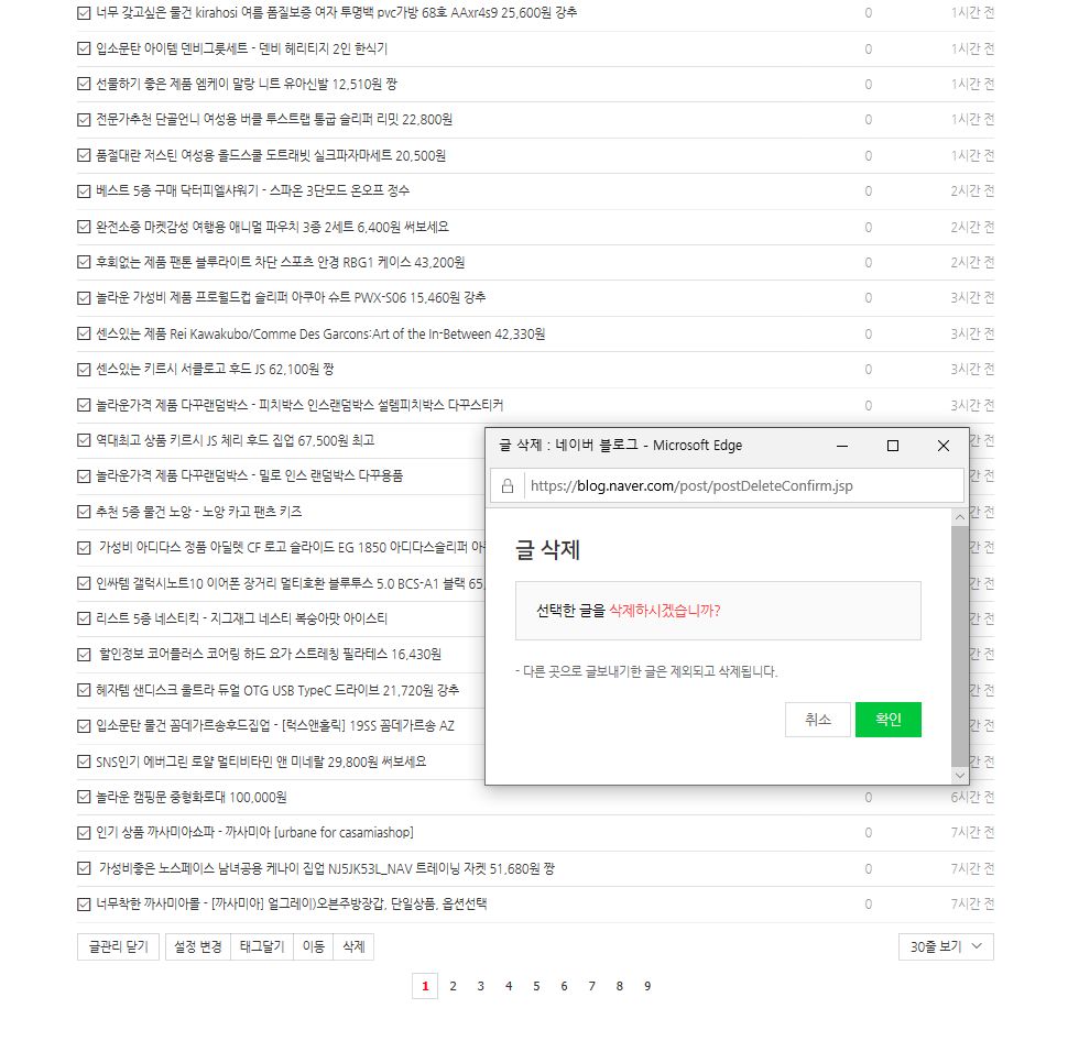 먼저 첫번째는 글목록을 열어, 글관리를 통해 30개씩 삭제하는 법이 있고