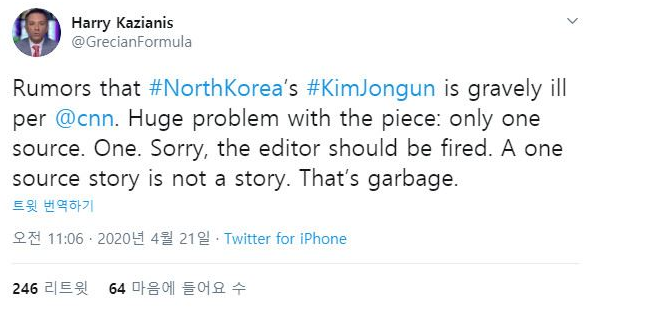 김정은 북한 국무위원장이 수술 후 심각한 위험에 빠진 상태라는 정보를 미국 정부가 주시하고 있다고 미국 CNN방송이 미국 관리를 인용해 20일(현지시간) 보도했다고 하네요