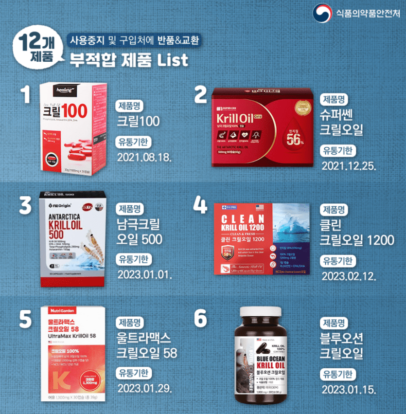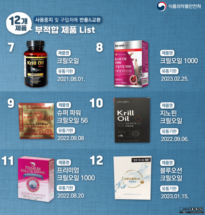 식약처에서 발표한 부적합받은 크릴오일 제품 목록입니다
