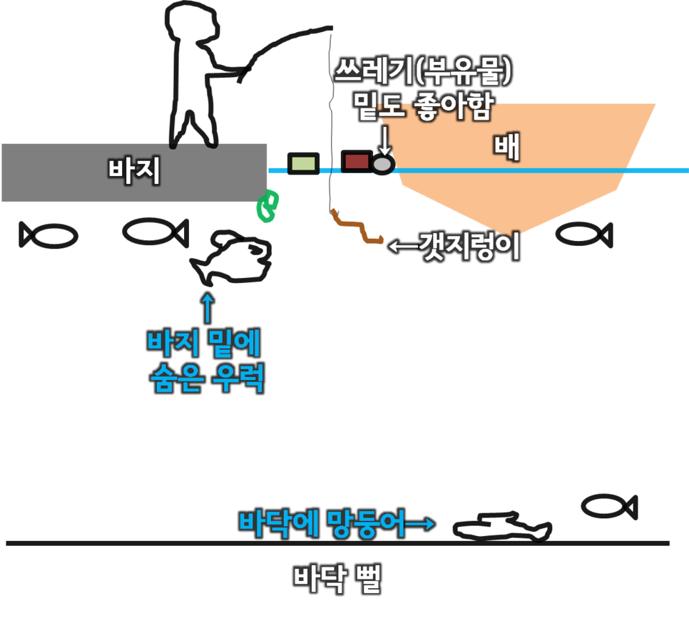 바지와 배사이 곳곳에 미끼를 바닥으로 쭉 내려 주기만 하면된다