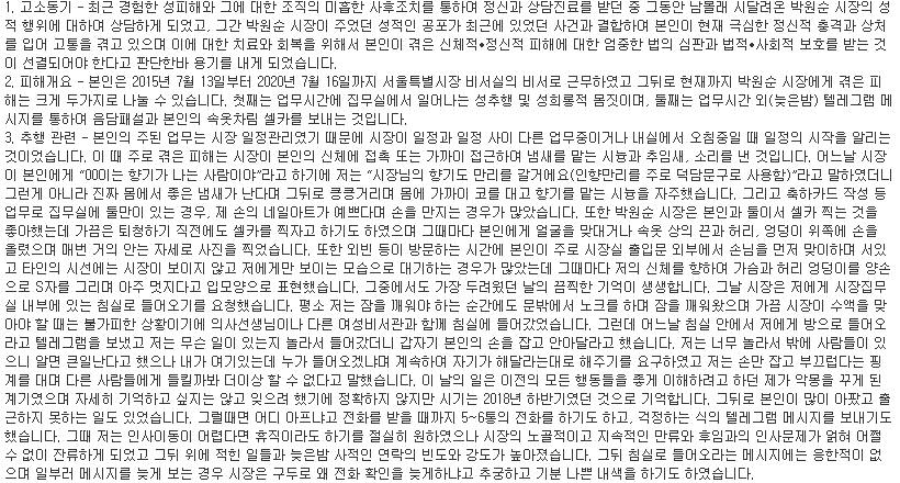 본인은 지금부터 박원순 시장으로부터 받은 업무상 위력에 의한 추행에 대하여 밝히고자 합니다. 1. 고소동기 - 최근 경험한 성피해와 그에 대한 조직의 미흡한 사후조치를 통하여 정신과 상담��
