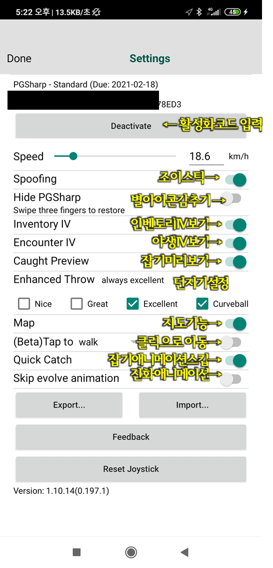 5. 그외에 설정에서 퀵캐치나 인벤토리IV보기, 자동 엑셀런트커브볼 기능들이 쓰기 좋네요